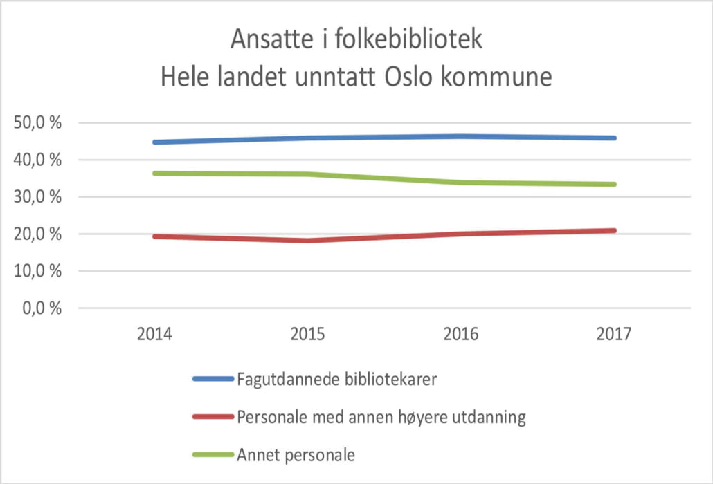 Tallenes tale er tydelig. Norske folkebibliotek har omtrent lik andel fagutdannede bibliotekarer i sitt personale i 2017 som de hadde i 2014. Det er Oslo som skiller seg merkbart ut.
