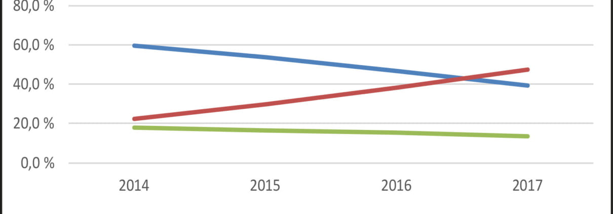 Men rekrutteringspolitikken ved Deichman kan best leses ut av tallene som viser hvor stor prosentvis andel av personalet som de fagutdannede utgjør, og tilsvarende hvor stor andel de med annen høyere utdanning utgjør. Utviklingen i perioden 2014-2017 går fram av diagrammet under: