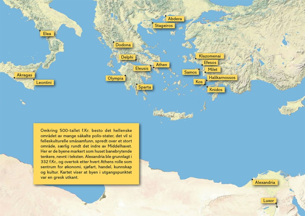 Omkring 500-tallet f.Kr. besto det hellenske område av mange såkalte polis-stater, det vil si felleskulturelle småsamfunn, spredt over et stort område, særlig rundt det indre av Middelhavet. Det var eksempelvis Athen, Sparta, Dodona, Kos, Milet, Efesus, Halikarnossos. Athen utgjorde et slags sentrum for disse småsamfunn, som ble holdt sammen av blant annet språk, myter, religion, historie, tradisjoner etc. Det var andre, liknende samfunn også, eksempelvis det persiske og det egyptiske.