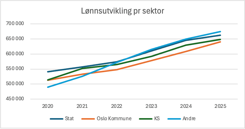 Hvis vi ser på lønnsutvikling i ulike sektorer, var det også i 2025 medlemmene i gruppa «andre», altså de som ikke er kommunalt eller statlig ansatt, som hadde den største lønnsøkninga, med hele 7,7 prosent.