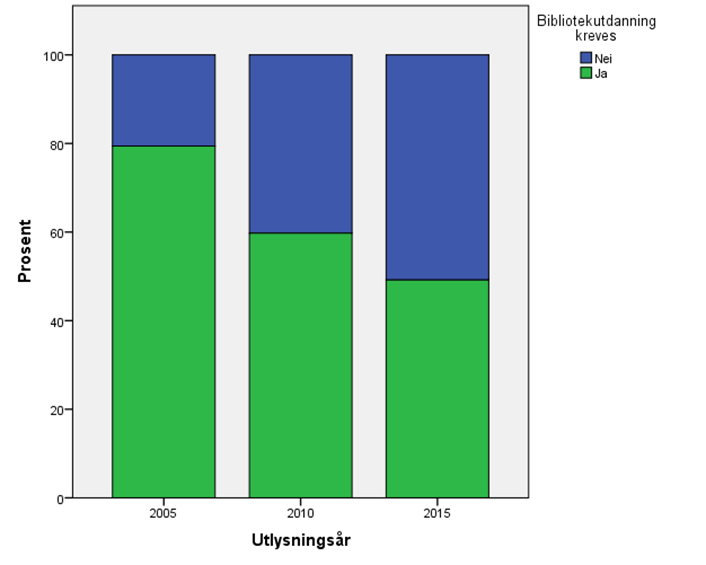Bibliotekutdanningen ble nevnt i 84 prosent av stillingsutlysningene, med en nedgang i perioden fra 2005 (94 %) til 2010 og 2015 (82 %). Av de 16 prosent der bibliotekutdanning ikke ble nevnt spesifikt etterspurte 61 prosent av disse i stedet «relevant utdanning». Det er naturlig å anta at kommunene i denne ordlyden også aksepterte bibliotekutdanning som betydningsfull, men den ble ikke spesifisert. Videre ble andre utdanningsmuligheter nevnt i sammenheng med 23 prosent av stillingene der bibliotekutdanning var etterspurt. Når alle stillingene som nevnte annen utdanningsbakgrunn enn bibliotek ses under et, uavhengig av om det var i kombinasjon med bibliotekutdanning eller ikke, ble «annen relevant utdanning» nevnt i ca. fire av fem utlysninger.