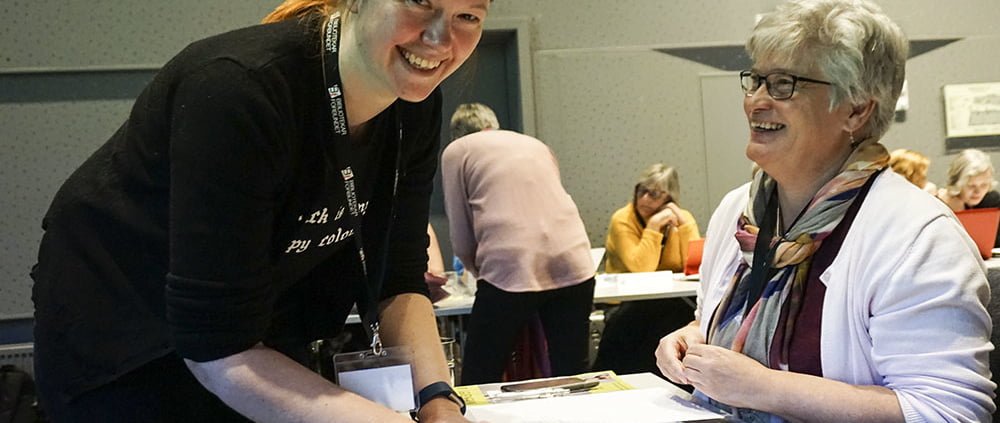 Siv Jørstad (til venstre) fremmet forslaget som ble vedtatt på landsmøtet i 2017. Her i samtale med Anne Cathrine Undhjem. (Foto: Erling Bergan)