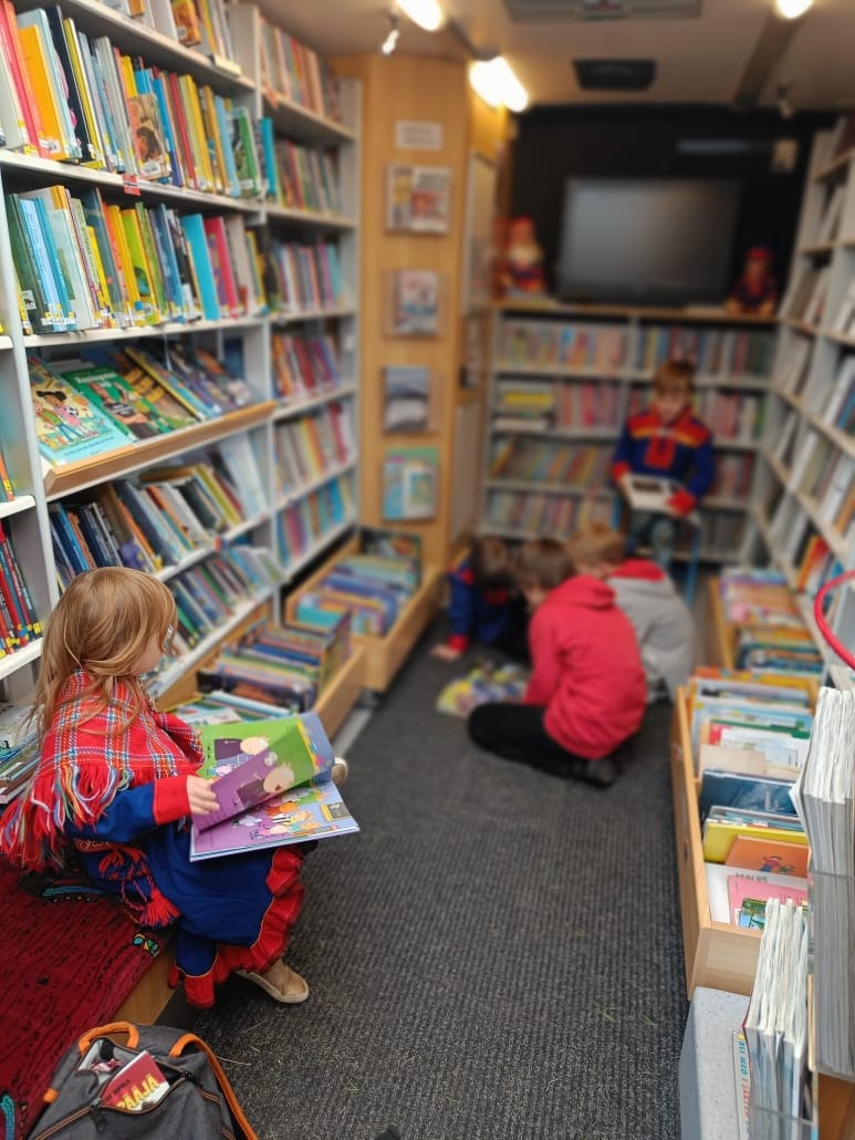 En stim fargerike tre-skulpturer av laks står på stake utenfor skolen. På ytterveggen: Bilder av lemen, rein, rev og rype. Bussdøra går opp, og motoren tar til å knurre biskt før den roer seg helt ned igjen for å slippe inn lyden av energiske barn, latter og hyl. De kommer nærmere, bussen sirkles inn, men idet de går inn gjennom døra er det som om de passerer en portal som sikter ut rop og hyl. Hele skolen er inni bussen samtidig, nærmere bestemt 15 elever og fire lærere. Det står tre språk i hyllene og tre språk snakkes i midtgangen. De vandrer frem og tilbake som tente lys og leter etter bøker om scootere, rein, hester og enhjørninger. Villmark og fantasi i skjønn forening. En av lærerne, Essi Maria, har funnet gull. Hun bærer på en stabel med bøker om duodji – samisk kunsthåndverk. Hun spør meg om jeg snakker samisk eller finsk, og jeg svarer norsk og engelsk.